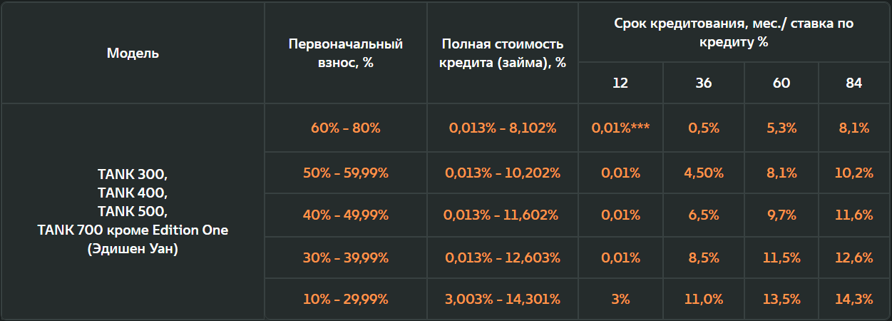 ** Предложение распространяется на новые автомобили TANK 300, TANK 400, TANK 500, TANK 700 кроме EDITION ONE, приобретаемые у официальных дилеров по тарифу DIRECT*. Полная стоимость кредита (далее – ПСК) рассчитывается для каждой процентной ставки. Размер процентной ставки зависит от первоначального взноса и срока кредита. Срок кредита: 12мес, 36мес, 60мес и 84мес, при первоначальном взносе от 10% до 80%. Оценивайте свои финансовые возможности и риски. При первоначальном взносе от 10% до 30% ПСК составляет 3,003%-14,301%, размер процентной ставки от 3,00% до 14,30%. Диапазон Полной стоимости кредита в % годовых составляет от 0,013% до 8,102% размер процентной ставки составляет от 0,01% до 8,10%. на диапазонах первоначального взноса от 60% до 80% от стоимости автомобиля. Диапазон Полной стоимости кредита в % годовых составляет от 0,013% до 10,202% размер процентной ставки составляет от 0,01% до 10,20% на диапазонах первоначального взноса от 50% до 60% от стоимости автомобиля. Диапазон Полной стоимости кредита в % годовых составляет от 0,013% до 11,602% размер процентной ставки составляет от 0,01% до 11,60% на диапазонах первоначального взноса от 40% до 50% от стоимости автомобиля. Диапазон Полной стоимости кредита в % годовых составляет от 0,013% до 12,603% размер процентной ставки составляет от 0,01% до 12,60% на диапазонах первоначального взноса от 30% до 40% от стоимости автомобиля. Диапазон Полной стоимости кредита в % годовых составляет от 3,003% до 14,301% размер процентной ставки составляет от 3,00% до 14,30% на диапазонах первоначального взноса от 10% до 30% от стоимости автомобиля Сумма кредита от 100 000 руб. до 12 000 000 руб. Условия и тарифы могут быть изменены банком в одностороннем порядке. Банк в праве отказать в выдаче автокредита без объяснения причин. Условия кредитования актуальны на 02.02.2026г. Предложение носит информационный характер, не является публичной офертой. Ваш размер платежа будет определен по результатам рассмотрения заявки. Кредит предоставляется АО ТБанк, ОГРН 1027739642281 ИНН 7710140679, адрес: 127287, город Москва, ул. Хуторская 2-Я, д. 38а стр. 26. Генеральная лицензия №2673 от 09.07.2024. Изучите все условия кредита (займа) на сайте https://tank.ru/. * Прайм