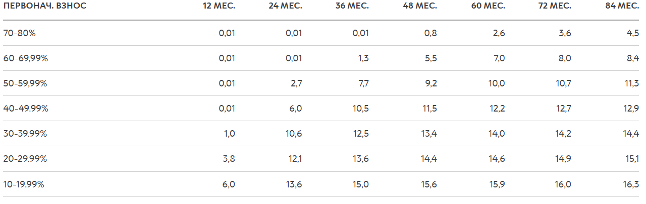 При первоначальном взносе от 70% до 80% ПСК составляет 0,01%-4,497%, размер процентной ставки от 0,01% до 4,4% - достигается при сроке от 12 мес. до 84 мес.