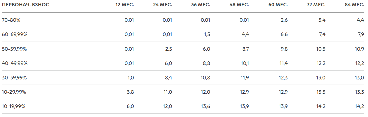 При первоначальном взносе от 30% до 40% ПСК составляет 0,987%-12,997%, размер процентной ставки от 1% до 13% достигается при сроке от 12 мес. до 84 мес.